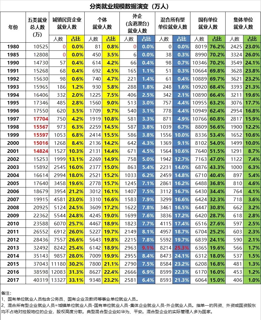 而在工商业领域,除了金融以及大宗商品行业外,在2000年之后大都已经放开,允许老百姓参与挣钱。同时,我大中国对老百姓的工商业经营活动予以严厉的管制,行政管控触角深入到企业经营活动的方方面面。工商局、劳动局、街道办、环保局、派出所、税务局、城管、妇联、财局、消防局、质监局……数得出名字的每一个政府部门都有权光明正大的干预企业经营。然而就算是这样,一穷二白的国人依然爆发了巨大的生产热情。民营企业的规模迅速扩大,1997年民营企业的就业人数只有可怜的750万,此后工商业领域的第四类动员开始,到2005年民企就业人数就达到了3458万,2010年6070万,2017年已经达到了13327万,较当年度国有单位6064万的就业人数高出了一倍有余。